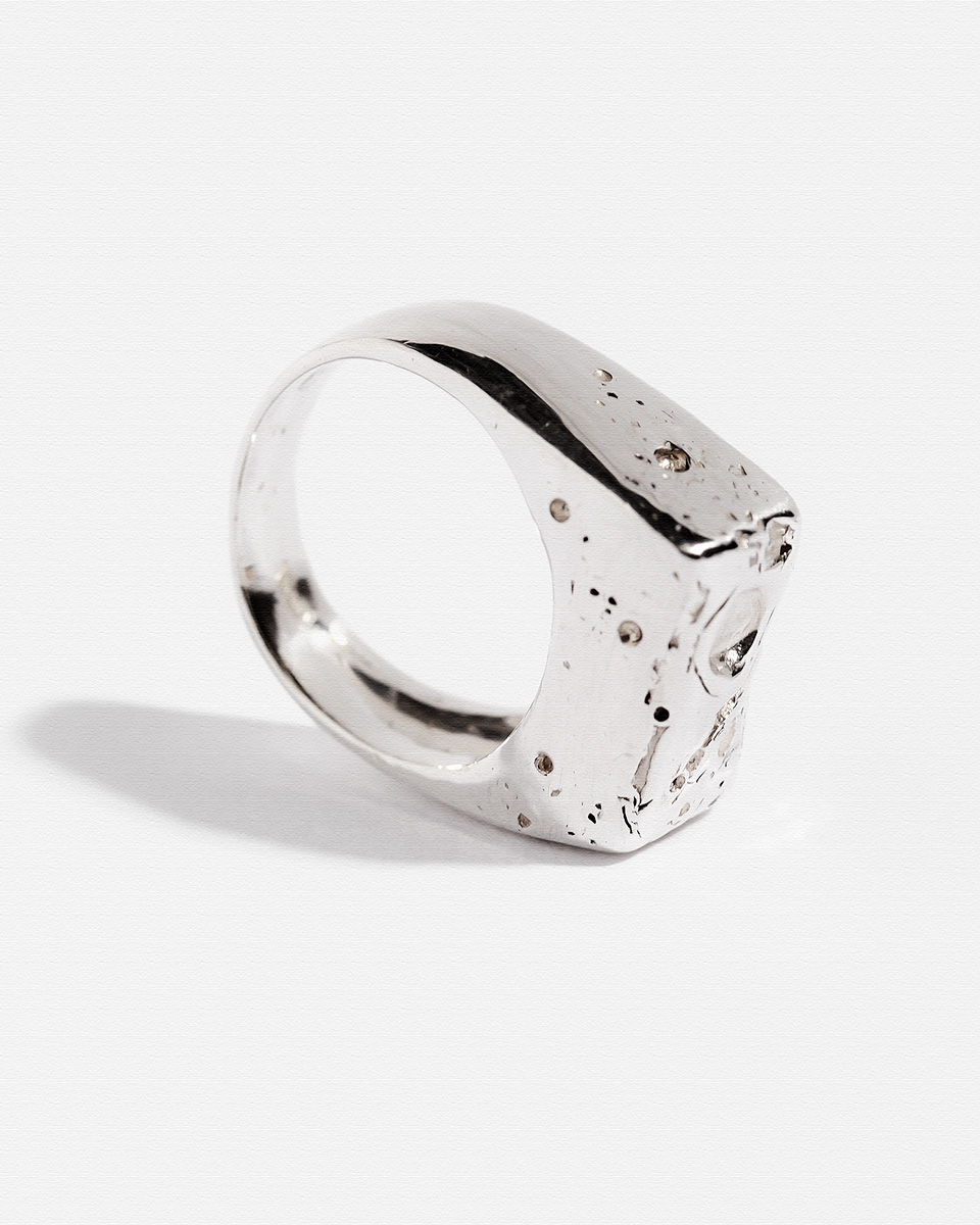 Inspired by the surface of the moon. Cracks, craters and depressions reinterpret the classic shape of a chevalier ring, giving it an otherworldly air..